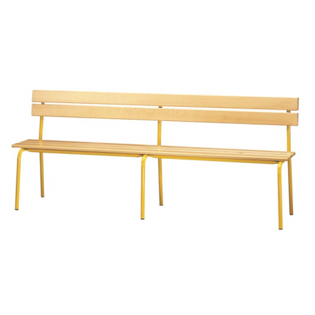 Assise en hêtre massif 90 x 20 mm en applique sur la structure. Finition vernis naturel. Structure monobloc en tube Ø 25 mm, ép. 1,5 mm. Renfort sous l’assise tube Ø 25 mm. Empilable.