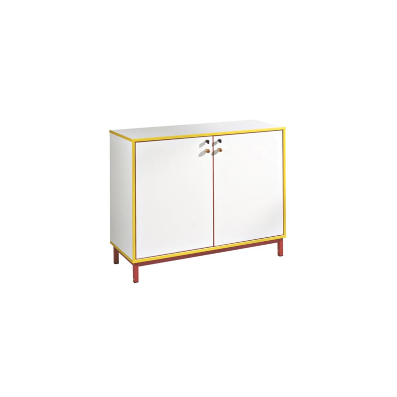 Corps en panneau de particules surfacé mélaminé ép. 19 mm avec chants ABS 2 mm. Tablettes réglables en hauteur par taquets. Porte(s) fermant à clé. Piètement en tube 30 x 30 mm, hauteur : 13 cm. Patins en PVC noir non tachant.1 séparation médiane. 4 tablettes réglables. L/H/P hors tout : 120 x 95 x 45 cm.